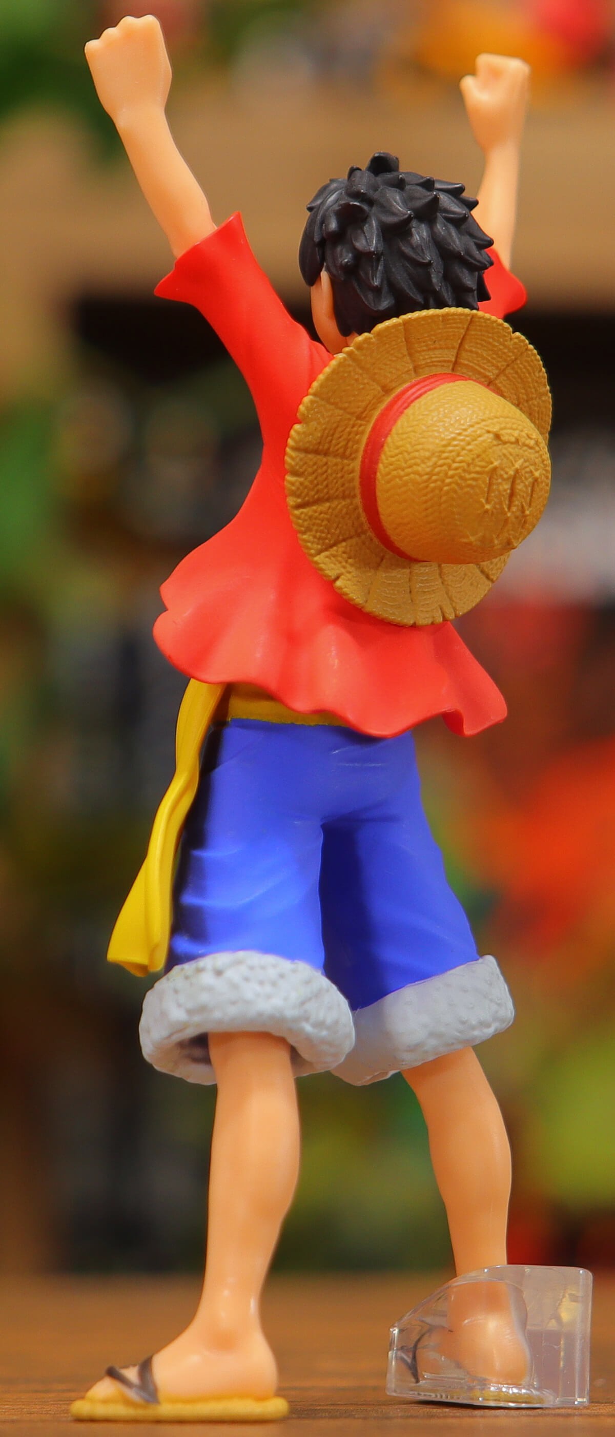 ルフィは麦わら帽子、赤いベスト、黄色いサッシュ、青いショートパンツ、トングサンダルといったスタイル。孫悟空のトレードマークである道着くらいド定番のファッションだ。赤い半袖Tシャツは袖や腹部のシャツの広がり、細かなシワ、裏地のペイント、金色のボタンなど造形や彩色が素晴らしい。