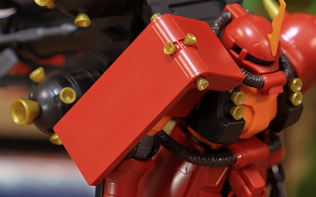 右肩にはザク・シールドを装備。ここにはボディやスカートより一段と小さいバーニアノズルが取り付けられている。
