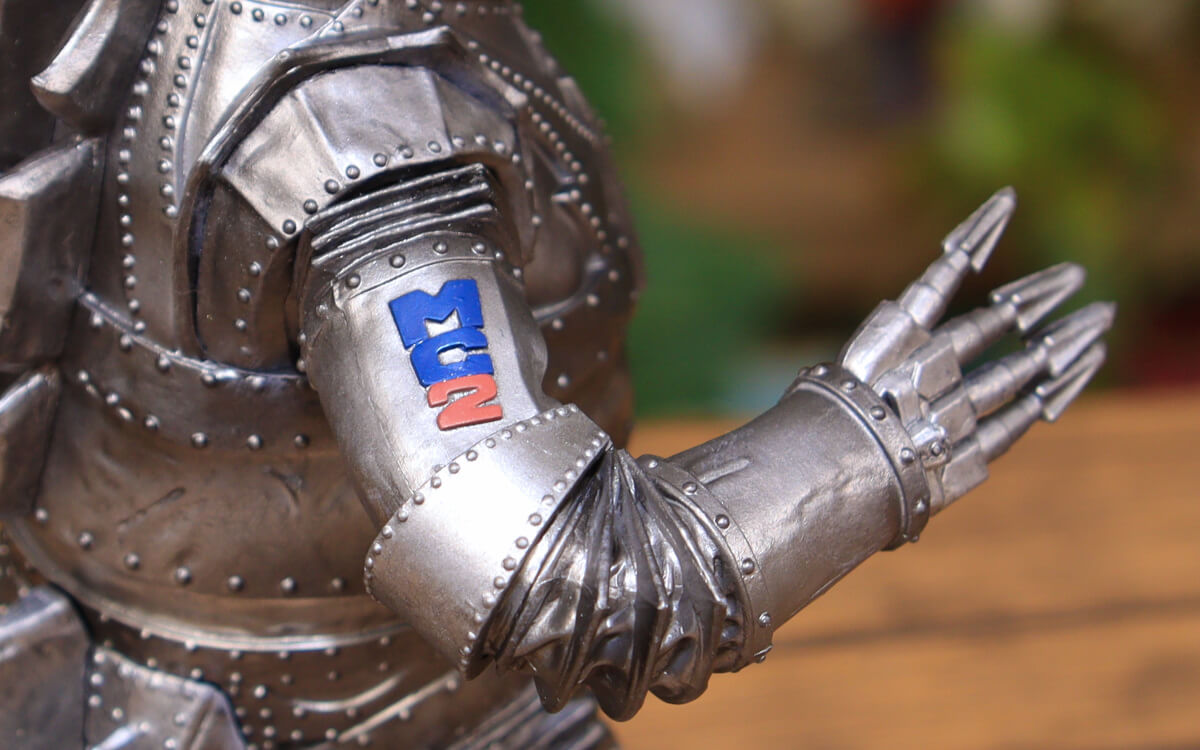 両方の二の腕にはMG2というエンブレムがあって立体的に表現。MG2はMechaGodzilla 2を略したもので、1974の初代メカゴジラから1975のメカゴジラ2になったことを示す。MGは青色、2は赤色で塗り分けされている点も再現度が高い。